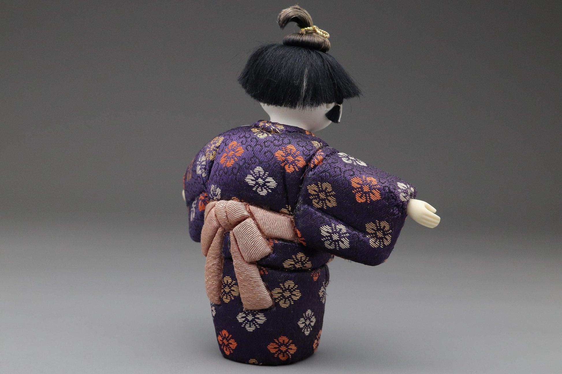 この木目込み人形は、広島県の山間に佇む築150年の伝統的な農家の土蔵で発見されました。1970年代後半に作られたとみられ、紫色の花菱文様が織り出された正絹の着物をまとい、柔らかな表情と上品な立ち姿が印象的です。木目込み技法の緻密な仕上がりが、この人形を名品としてより一層価値あるものにしています。