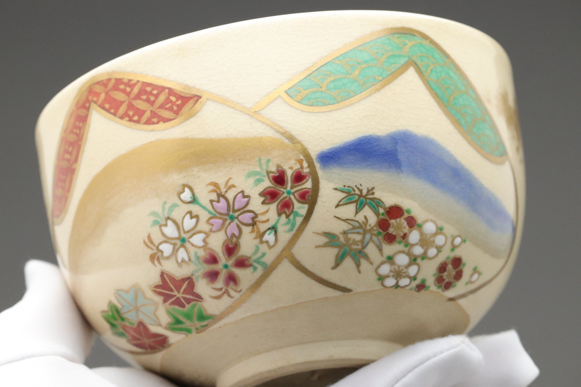 この抹茶茶碗は、温かみのあるクリーム色の台に、優美な手描きの絵柄が施され、繊細な金彩がアクセントになっています。扇形のパネルには、四季折々の花々や静謐な風景が描かれ、鮮やかな赤、緑、青が調和し、柔らかな彩りを添えています。表面には細かいひび割れ模様が広がり、年月を感じさせる上品な風合いを醸し出しています。