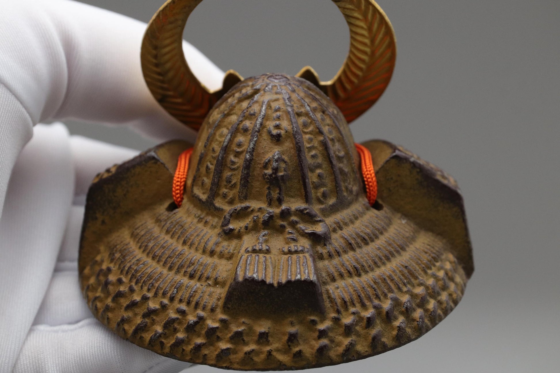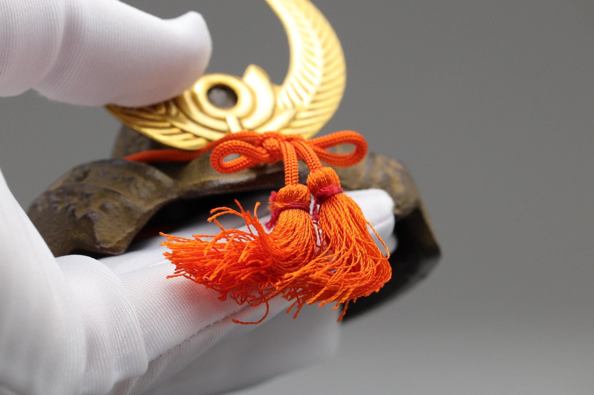 。鋳鉄製の兜は、重厚感があり、堂々とした存在感を放ちます。金色に輝く三日月型の紋章と鮮やかなオレンジ色の紐が、その優美な佇まいと伝統的な美意識をさらに引き立てています。