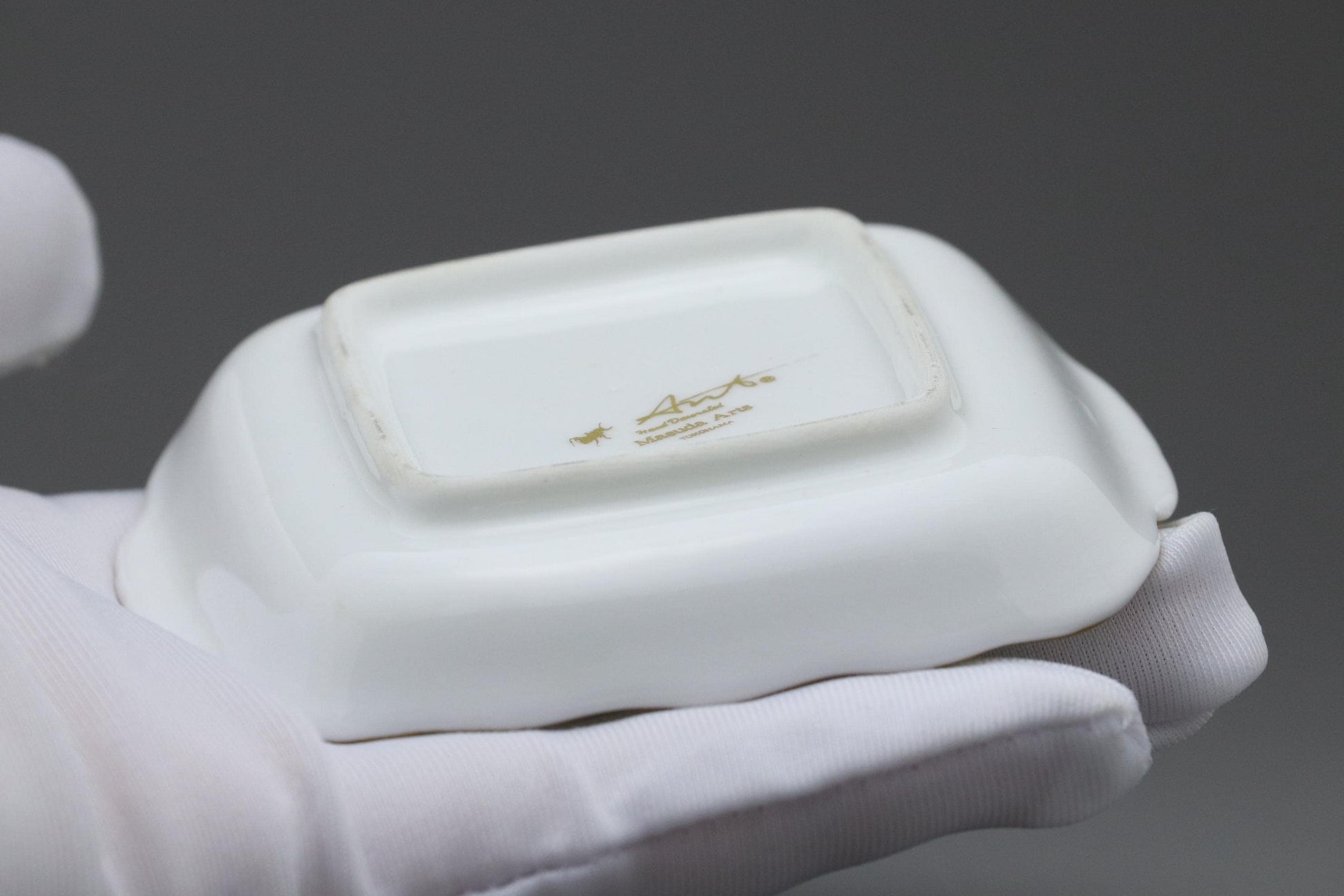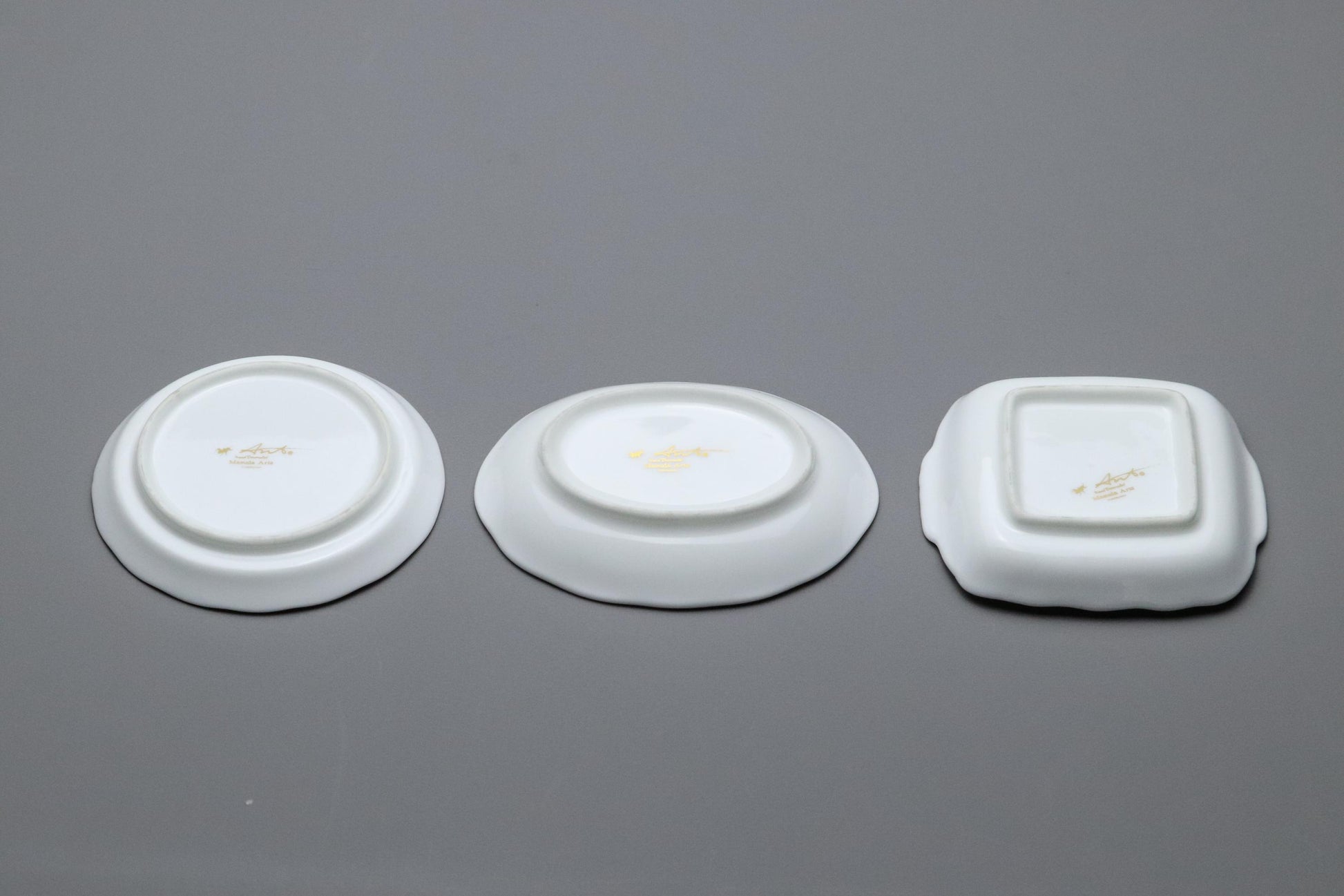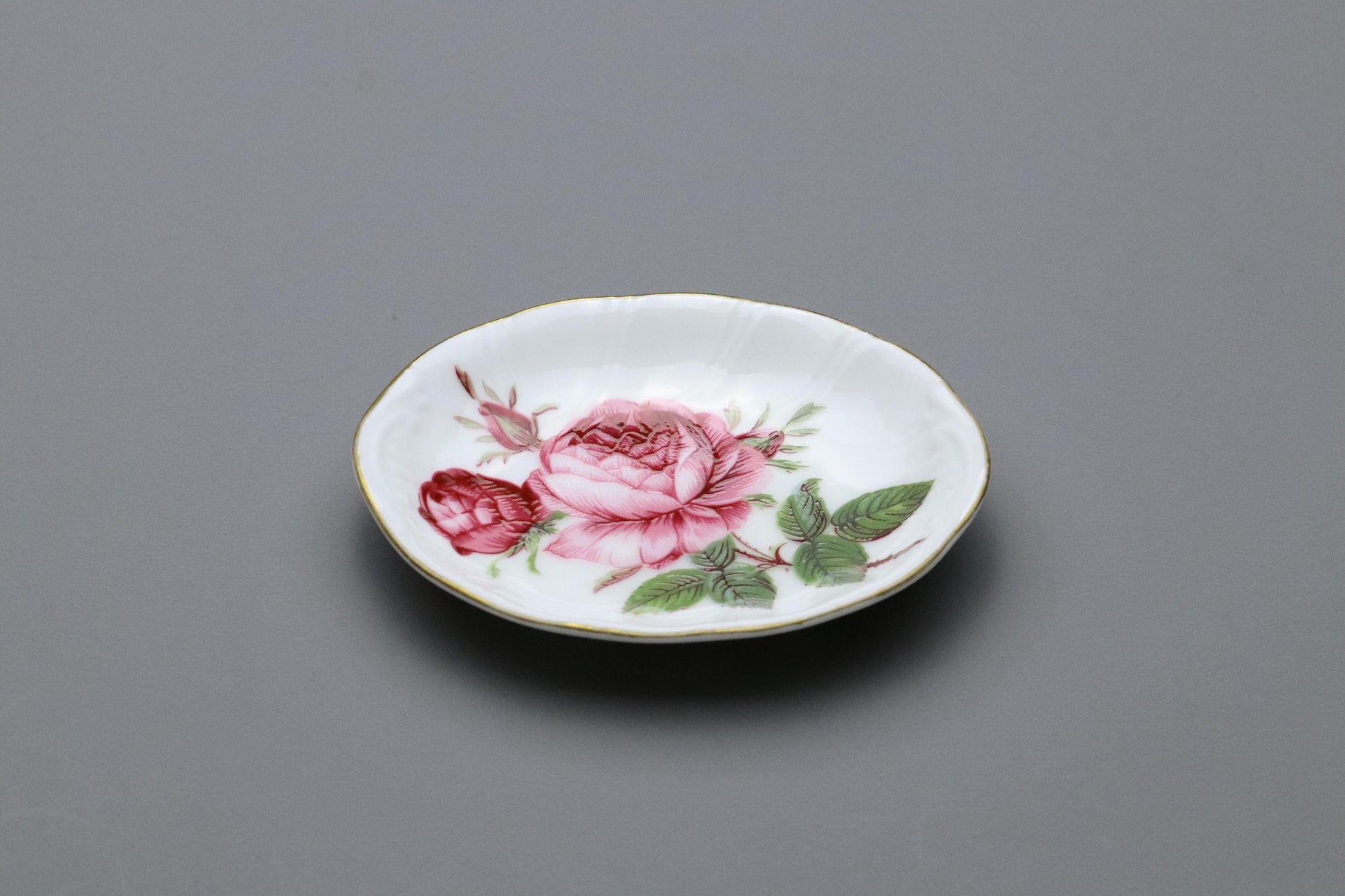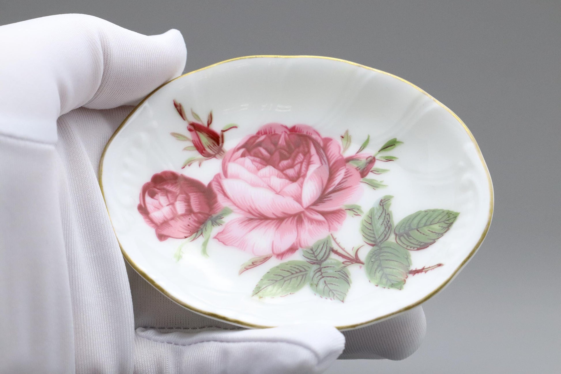 それぞれの皿は白磁で作られ、丸皿、楕円皿、四角皿がそれぞれ1枚ずつあり、すべてに「Masuda Arts Yokohama」の銘と手書きの「Art」の文字が刻まれています。バラのモチーフは鮮やかに残っており、金箔にはほとんど摩耗の跡が見られません。