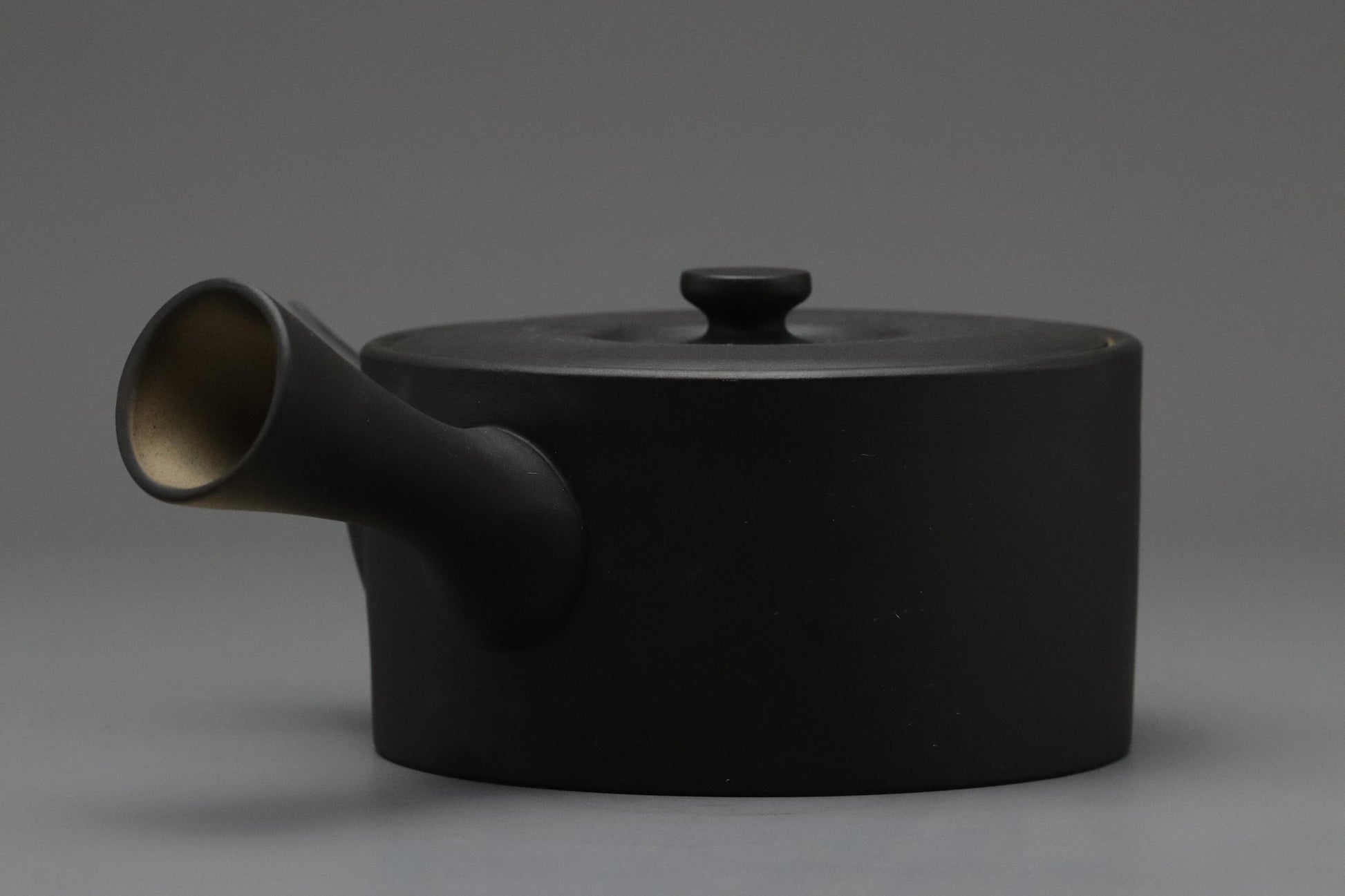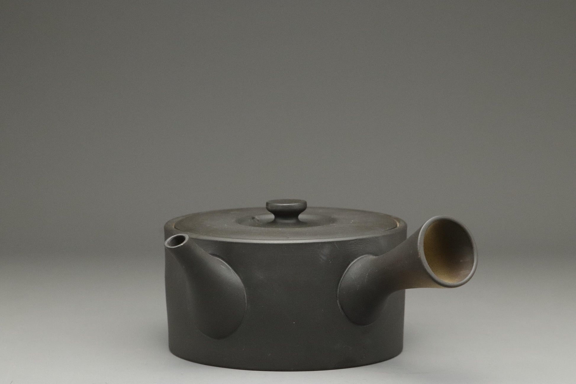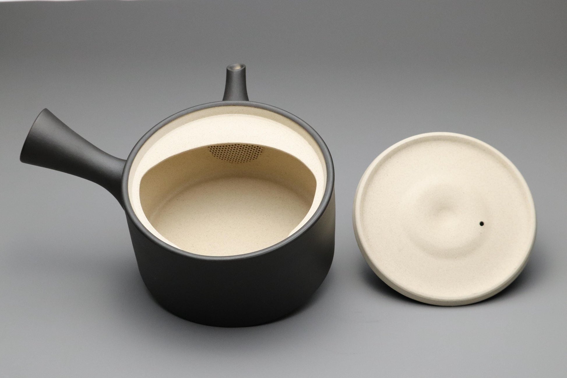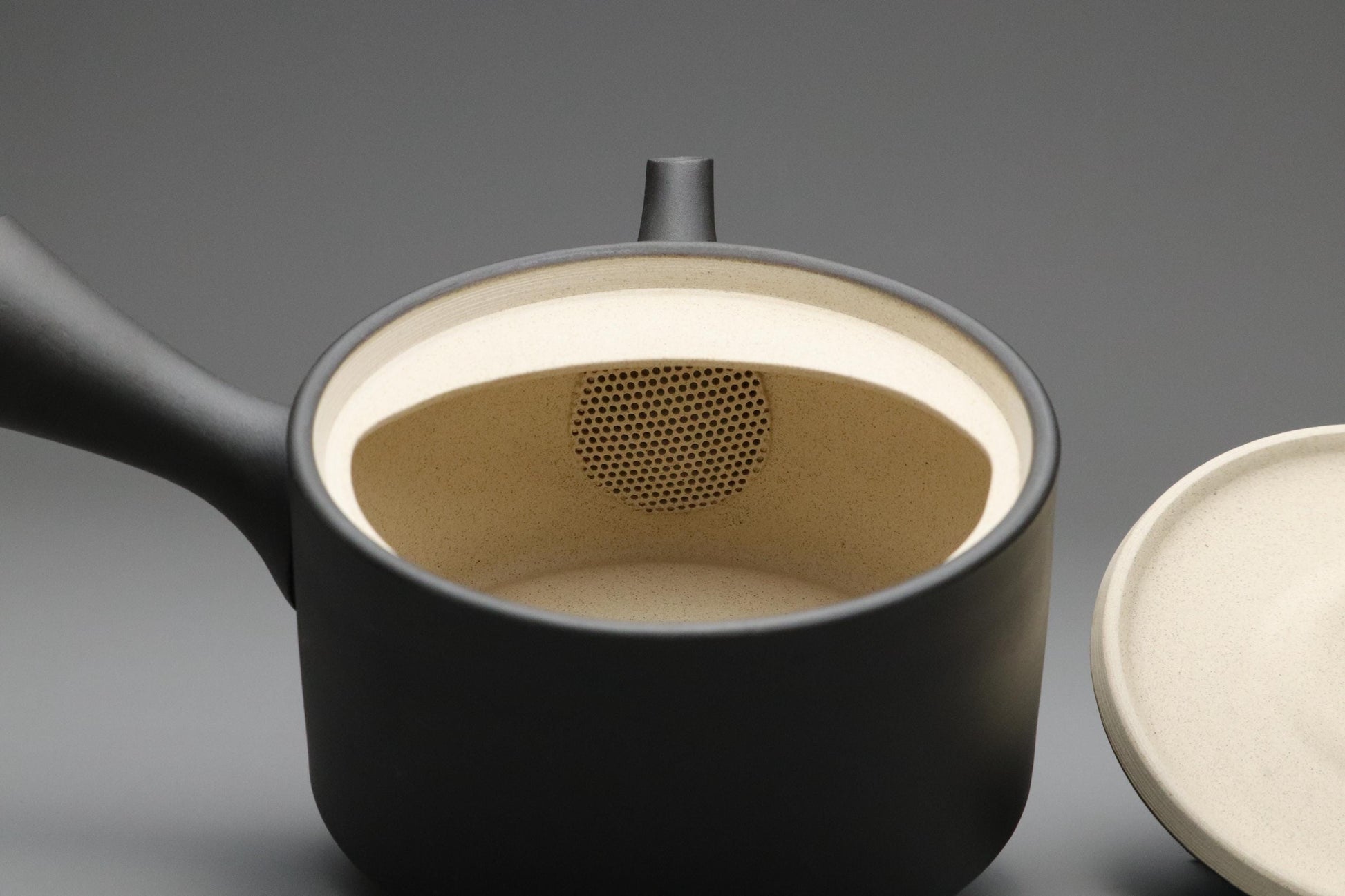 一般的な朱泥ではなく黒泥で作られたこの急須は、釉薬をかけていないため、土本来のタンニンを吸収し、緑茶の渋みをまろやかにします。滑らかでマットな質感は、使い込むほどに深みを増します。横手(よこて)ハンドルは片手で簡単に注ぐことができ、注ぎ口は絶妙な角度で、最後の一滴まで美味しくいただけます。内側には、金属メッシュの代わりに手作りの土こしが付いており、お茶の本来の風味を守ります。